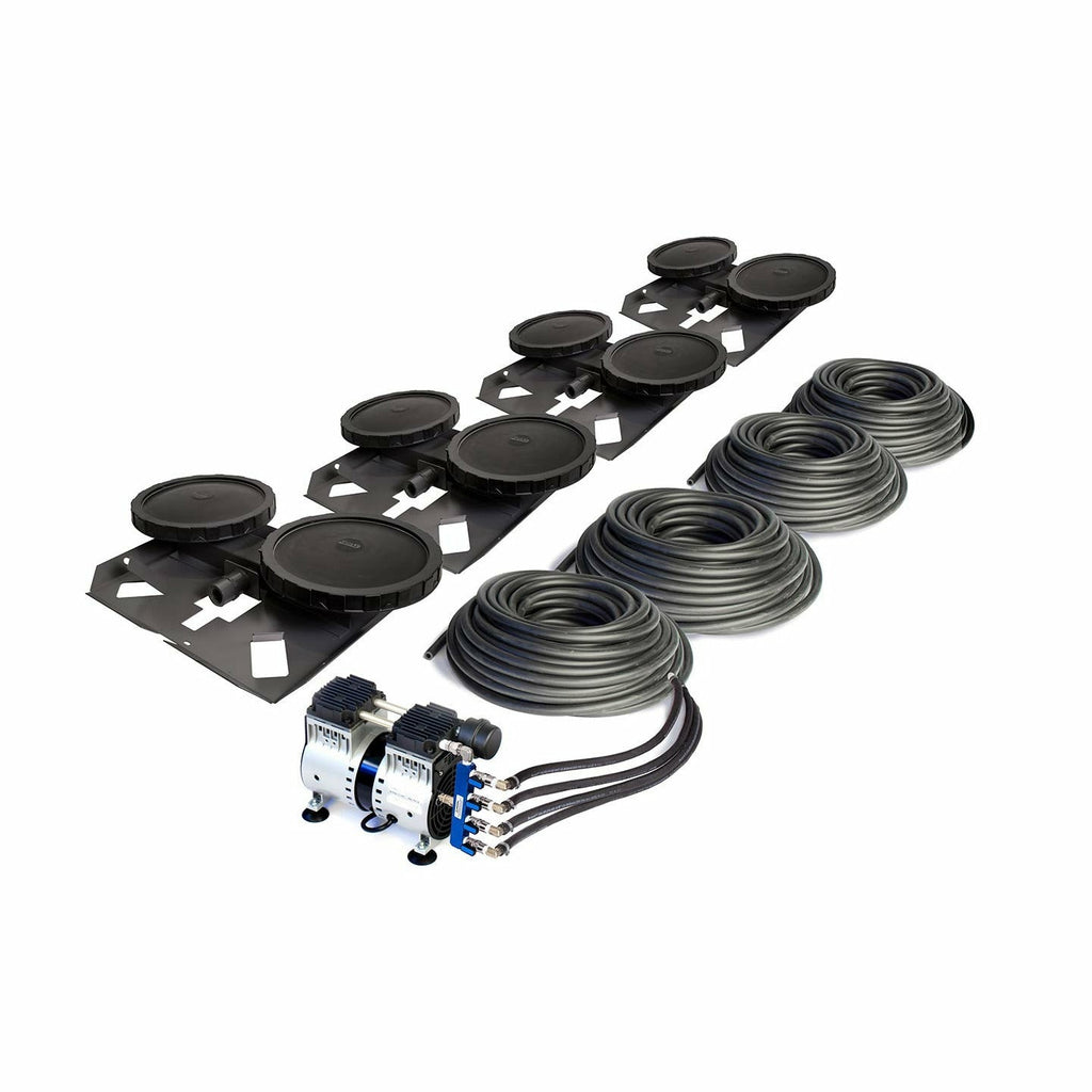 The Bubble Pro Max XL comes complete with four diffusers; four lengths of 100-foot by 3/8″ Quick Sink weighted tubing; a 3/4-hp, rocking-piston compressor; a valved air outlet assembly with individual controls for each hose and a pressure relief valve; and all required fittings and clamps. Designed for easy installation, the Bubble Pro Max XL comes with a two-year warranty. Also available for 230-volt power.