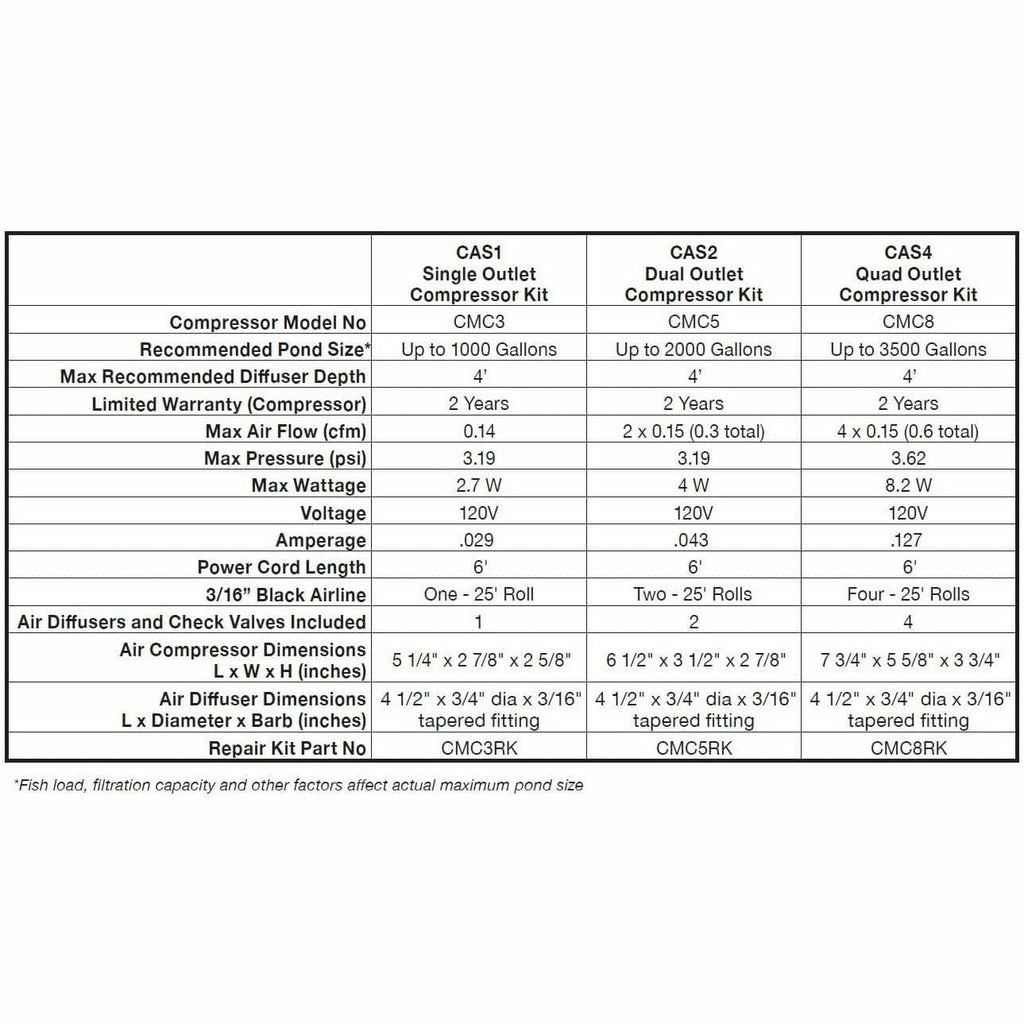 Our Compact Aeration Series provides adequate oxygen levels and circulation is critical for pond and fish care. During hot summer months or de-icing during freezing months the CAS Pond Aeration Kits will provide quiet and energy-efficient aeration. This complete kit is perfect for aquariums, water gardens or koi ponds.