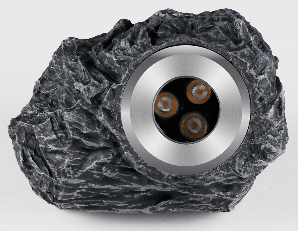 Realistic rock cover is molded from actual rock for a natural look that blends into the landscape of ponds, waterfalls and gardens. Stainless steel housing for long life. Safe for chlorine and salt water. Super bright, warm white lights are fully submersible and may be used in or out of the water. Bonus Feature! Rock cover is designed with an added flat surface to angle the beam upward if desired.