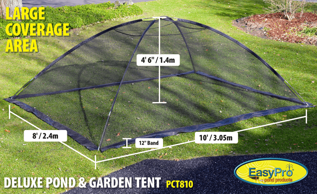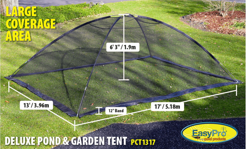 The Deluxe Pond Cover Tent offers complete pond and garden protection for leaves and unwanted pests! A simple two-person assembly can be completed and installed in just a few minutes. Strong, 3/8″ nylon black mesh netting is UV coated and will last for years. The dark mesh allows for easy viewing of your pond with the tent in place
