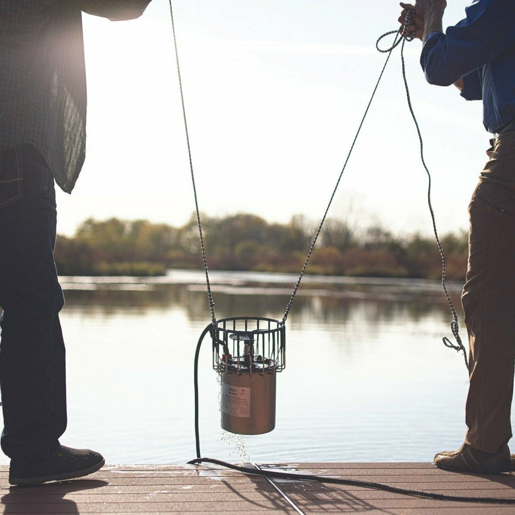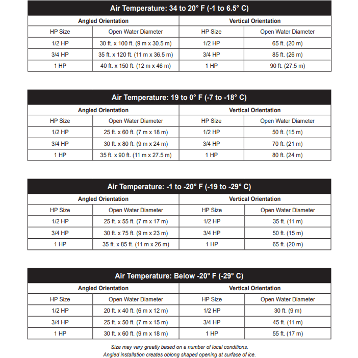 De-icers are available in 1/2, 3/4 and 1HP unit sizes and can easily be mounted with ropes (included) or a dock mount kit purchased separately. Time and temperature control panels are also available separately.