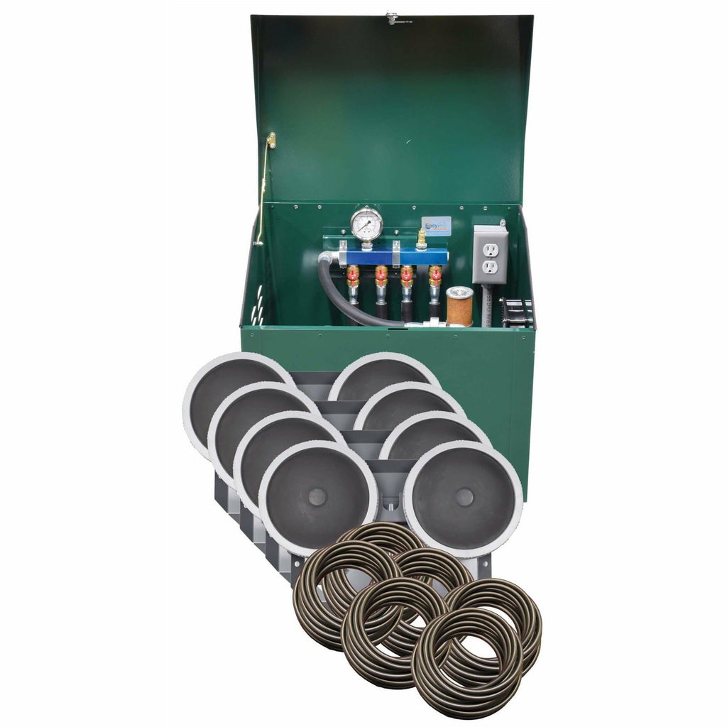 Complete Sentinel Deluxe Aeration System for ponds up to four acres depending on shape and depth of pond. 3/4 hp Rotary Vane RV75 compressor, 10 cfm, 12 amps, aerates up to 18′ deep. PA75D kit includes compressor, four valve outlet assembly, pressure gauge and pressure relief valve all mounted in SC22 lockable steel cabinet with cooling fan and electrical outlet installed. Now also with 6′ power cord pre-wired to plug cabinet system into GFCI protected outlet. Kit also includes four QS2 Quick Sink air diffusers, 600′ of 1/2″ Quick Sink tubing and fittings for connections.